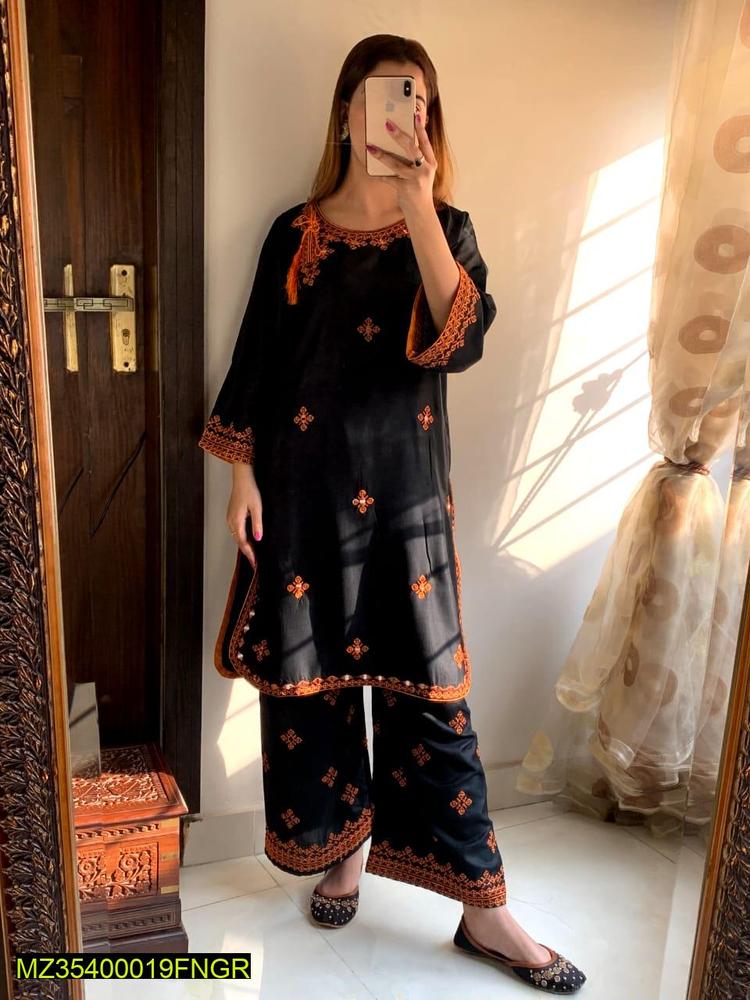 2 Pcs Women's Stitched Linen Embroidered Shirt And Trouser