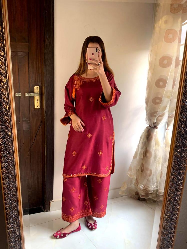 2 Pcs Women's Stitched Linen Embroidered Shirt And Trouser