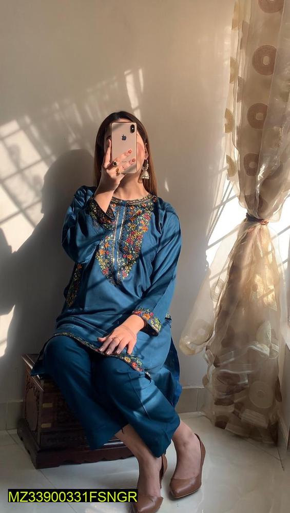 2 Pcs Women's Stitched Linen Embroidered Suit, Blue