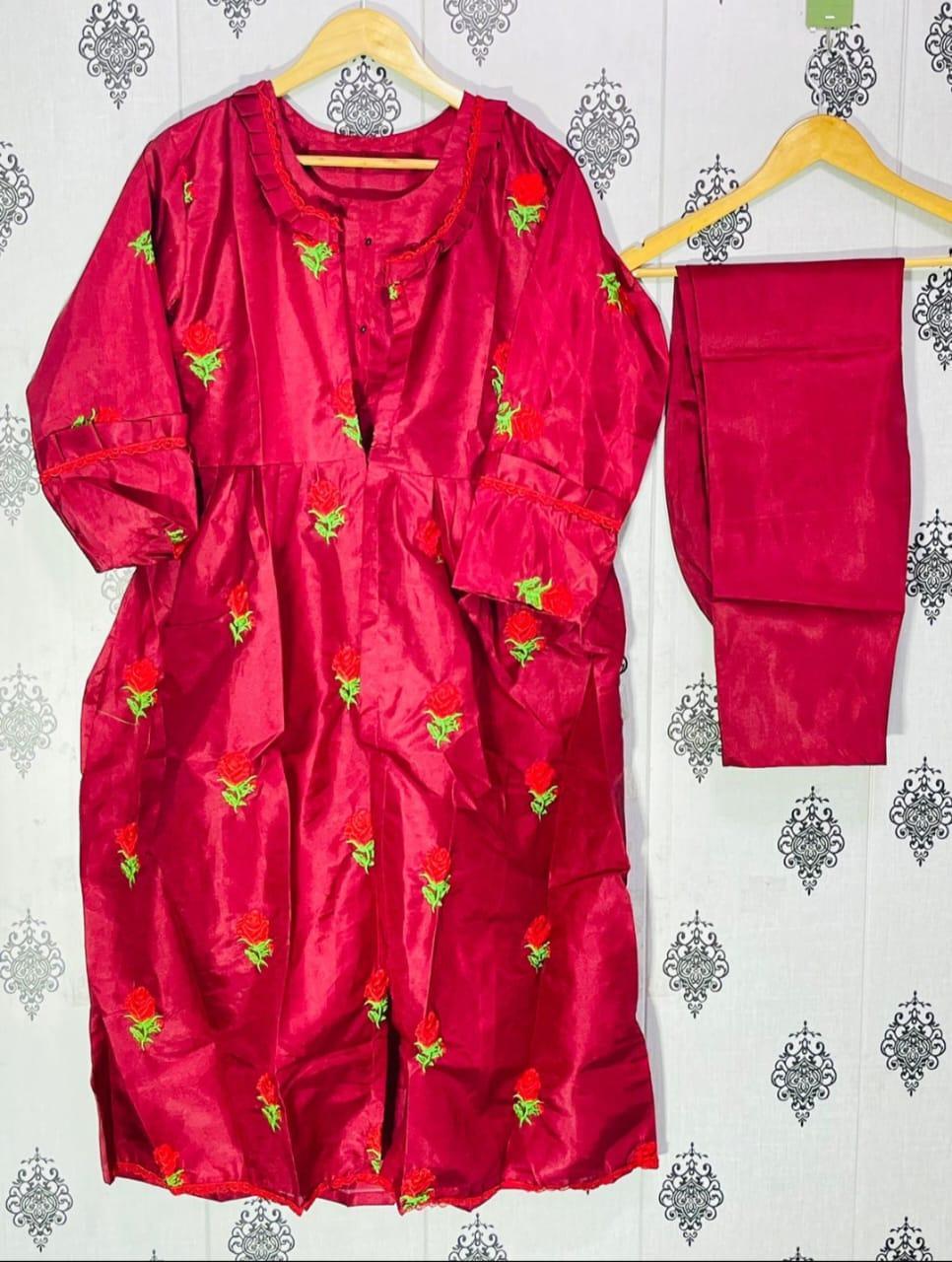 Elevate your style with this exquisite Women's Stitched Gown Suit set. Crafted from luxurious Katan Silk, it features intricate embroidery for a stunning look. The package includes a beautiful gown, inner shirt, and a pair of stylish trousers, available in medium and large sizes. Perfect for special occasions or festive celebrations!