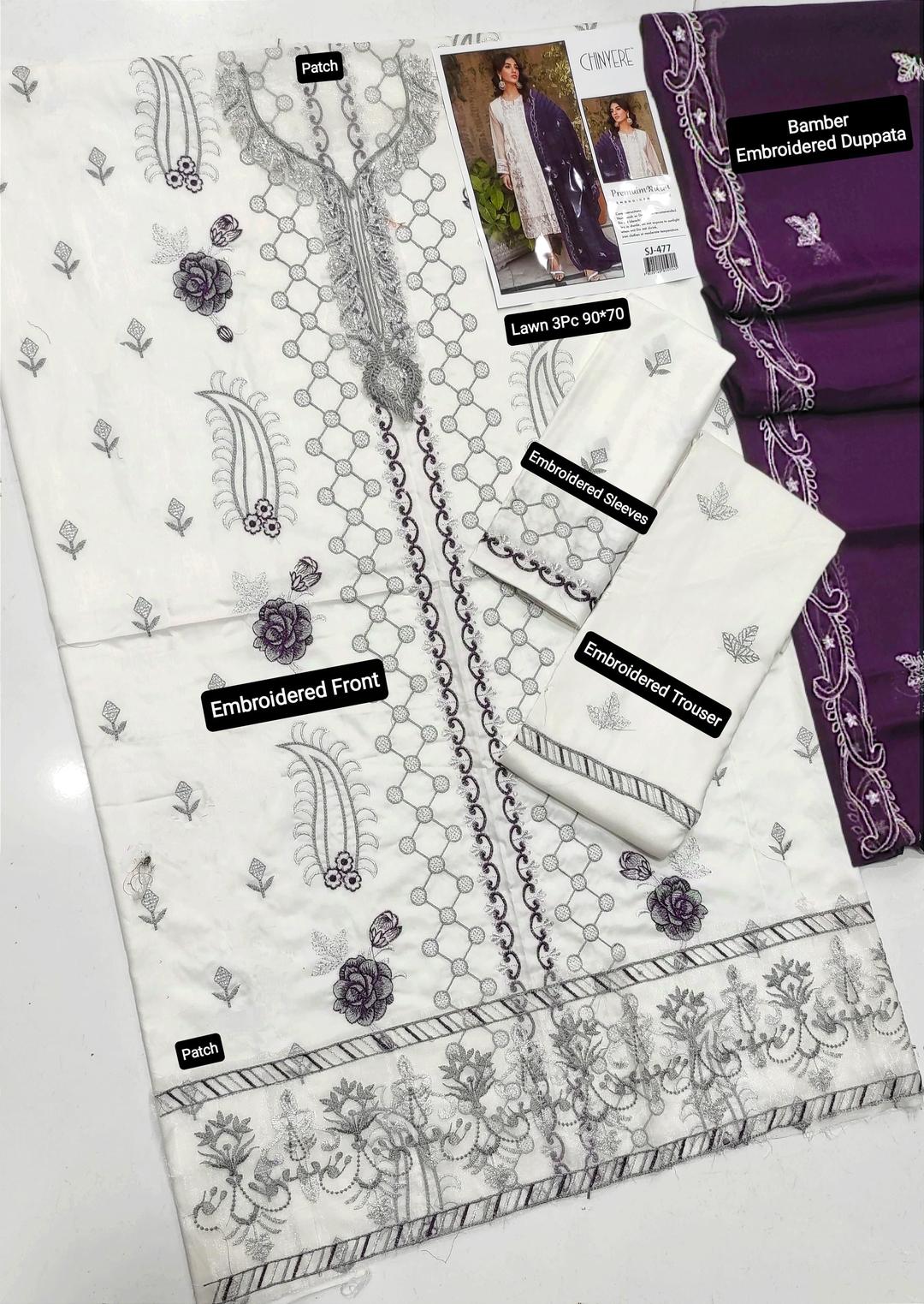 Elevate your traditional collection with this 3-piece unstitched suit crafted from premium lawn fabric. The white shirt features intricate embroidery on the front, sleeves, and includes detailed patch work at the neckline and daman for a refined finish. Complemented by a lawn trouser and a delicate embroidered bamber dupatta, this set offers both elegance and comfort. With generous fabric cuts—3 meters for the shirt and 2.25 meters each for trouser and dupatta—this ensemble provides ample material for a tailored fit to your exact preference.