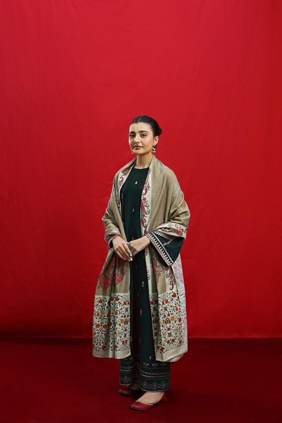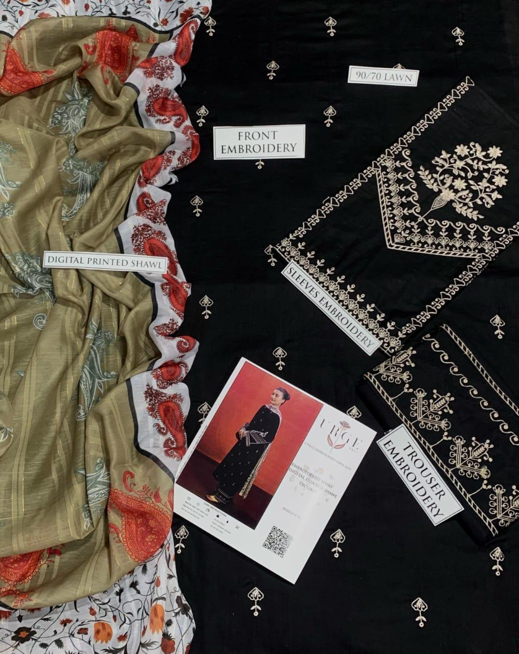 This 3-piece Lawn suit features elegant embroidered details, adding a touch of sophistication to the plain back pattern and diamond printed dupatta. Crafted with 2.5 gazz cutting, this set combines comfort and style in the timeless color black. Package includes shirt, trouser, and dupatta.