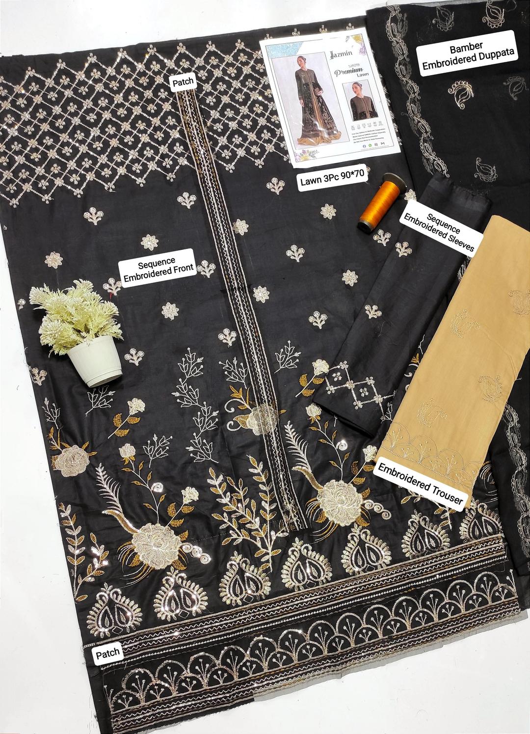 This elegant 3-piece women's unstitched suit features a black lawn shirt adorned with intricate sequins embroidery on the front and sleeves, complemented by patchwork detailing at the neckline and daman. The plain shirt back balances the design, while the embroidered lawn trouser adds subtle sophistication. Completing the set is a delicately embroidered bamber dupatta. With generous fabric cutting—3 meters for the shirt, 2.25 meters each for trouser and dupatta—this suit offers versatility for a tailored fit. Perfect for creating a refined, custom ensemble with expert craftsmanship in mind.