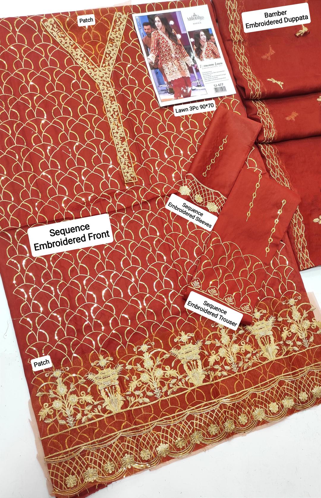 This 3-piece unstitched suit features finely embroidered sequins on a vibrant orange lawn fabric, accented with delicate patchwork on the neckline and daman. The set includes a 3-meter shirt, elegantly embroidered trousers, and a 2.25-meter bamber dupatta, all designed to offer versatility for tailored fits. The plain back of the shirt balances the detailed front and sleeves, creating a harmonious and sophisticated ensemble perfect for formal occasions.