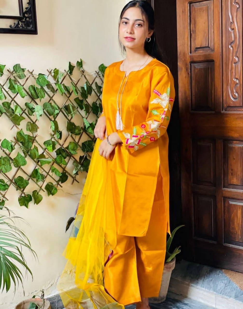 Exquisite Women's Stitched Embroidered Suit - 3 Pcs Set in Mustard Katan Silk